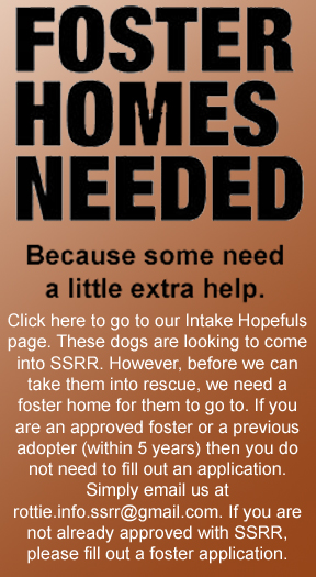 We are in need of foster homes! A foster home is a temporary home for one of our Rotties until SSRR finds a permanent home for the dog. A foster home provides the love and shelter for the dog while SSRR provides and pays for all medical needs. Being a foster home is not easy. Taking a Rottie into your home, caring for him, loving him, and then letting him go to a new forever home can be very difficult. But, fostering can also be the most rewarding and fulfilling thing a true dog lover can ever do to support dogs in need. If you are interested in becoming a foster home, please fill out a foster application.